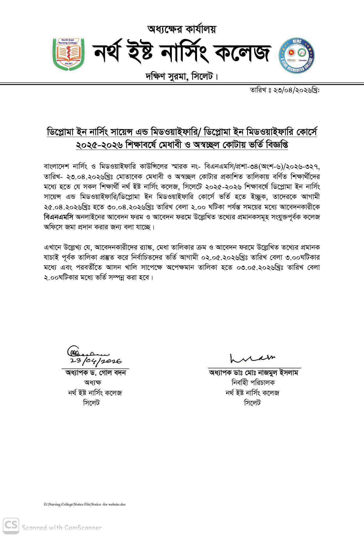 ডিপ্লোমা ইন নার্সিং সায়েন্স এন্ড মিডওয়াইফারি/ ডিপ্লোমা ইন মিডওয়াইফারি কোর্সে ২০২৫-২০২৬ শিক্ষাবর্ষে মেধাবী ও অস্বচ্ছল কোটায় ভর্তি বিজ্ঞপ্তি