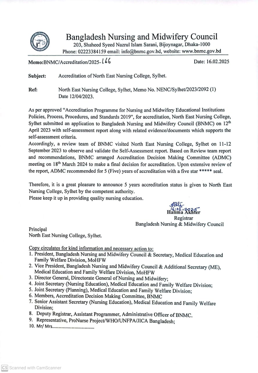 North East Nursing College, Sylhet is proud to announce that we have been awarded 5-year accreditation with a five-star (*) rating by the Bangladesh Nursing and Midwifery Council (BNMC).